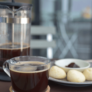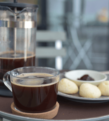 Café 100% brasileño, recién molido y preparado en prensa francesa + Pão de queijo tradicional, servido con mermelada de frutos rojos